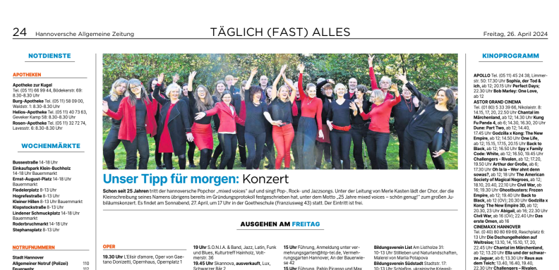Jubiläumskonzert von mixed voices am 27. April um 17 Uhr in der Goetheschule Hannover